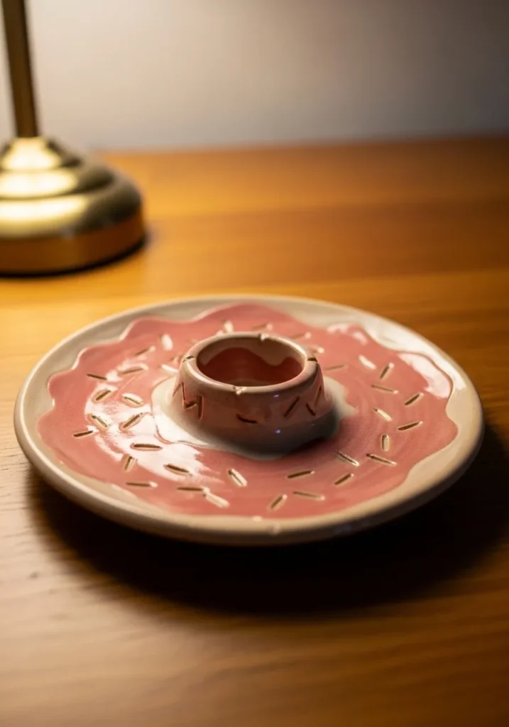 This playful ceramic plate features a raised donut shape in the center with tiny carved sprinkle details across the surface. The glaze is a soft pink with glossy white accents that highlight the texture. The shallow outer rim gives space for bracelets and small earrings. It feels cute and slightly nostalgic.