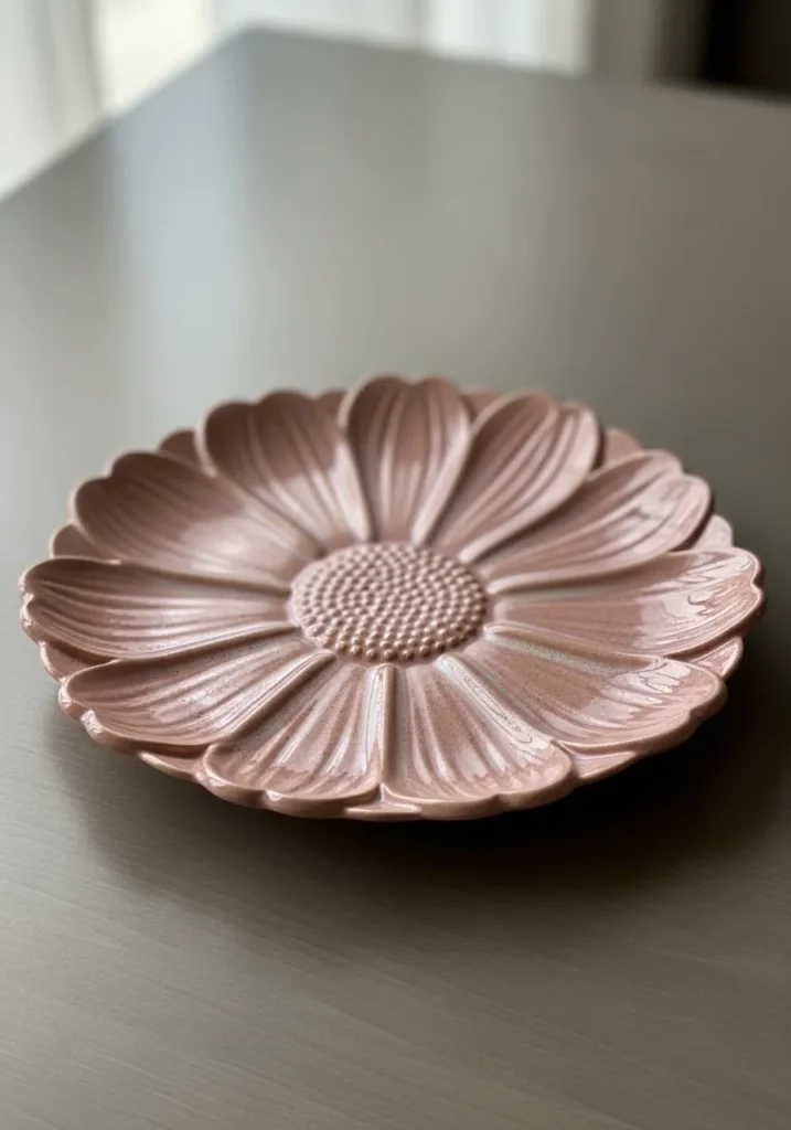 This delicate plate is shaped like a blooming daisy with layered petal ridges radiating from the center. The soft blush glaze enhances the texture and creates gentle shadows between each petal. The glossy surface catches light beautifully, making it perfect for styled photos. It feels feminine and graceful.