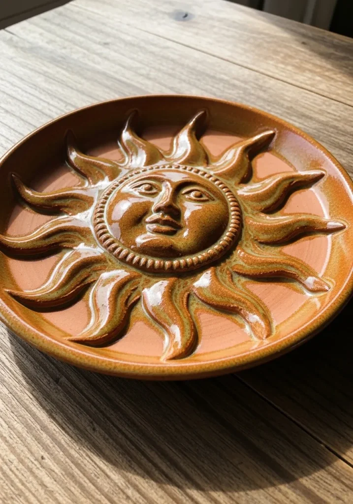 This warm terracotta plate features a raised sun face in the center with detailed rays surrounding it. The glaze highlights every carved line, giving depth to the expressive features. The shallow rim keeps small items from rolling away while maintaining a clean silhouette. It feels artistic and slightly vintage.