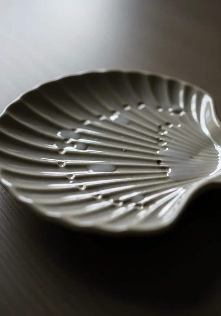 This sleek gray shell shaped plate features carved ridges that fan outward from the center. The glaze is smooth and semi glossy, giving it a calm minimalist look. The curved edges help corral small earrings and rings while keeping the overall design light. It feels coastal but modern at the same time.