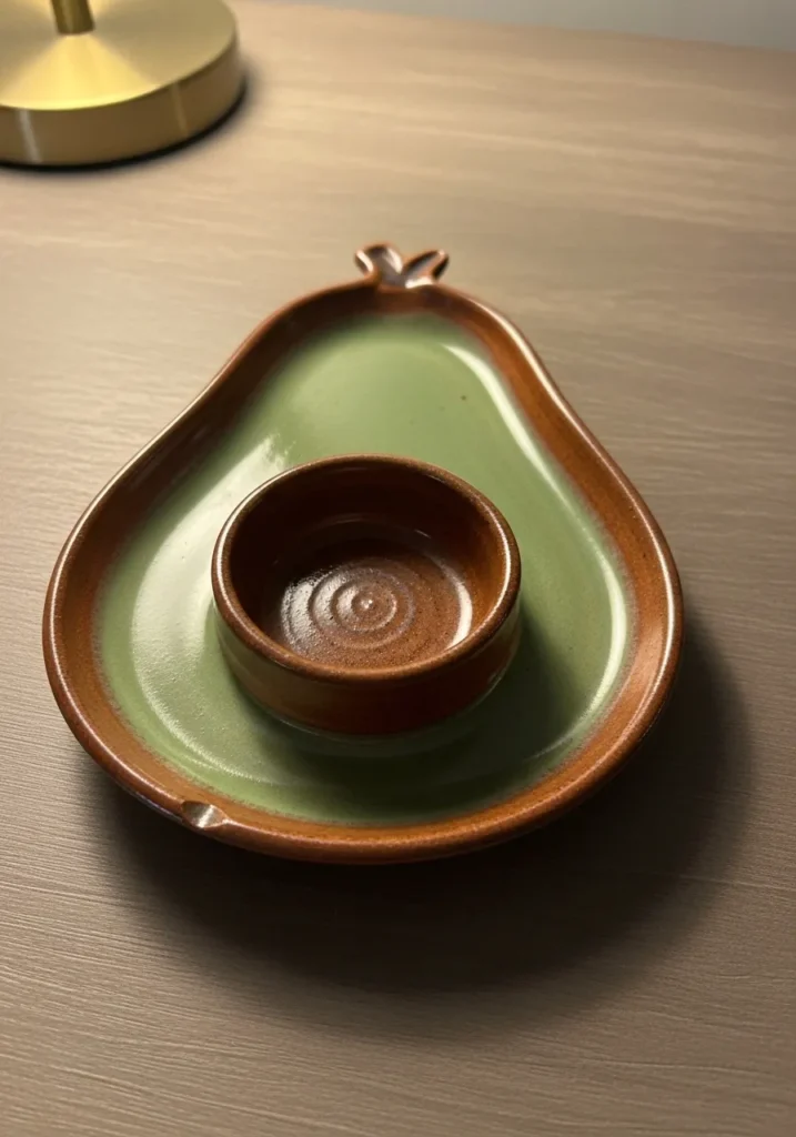 This adorable dish is shaped like a sliced avocado with a raised circular center where the pit would be. The interior glaze is a fresh green while the rim stays warm brown, creating a lovely contrast. The shallow base is perfect for stacking rings around the center bump. It feels quirky yet organized.
