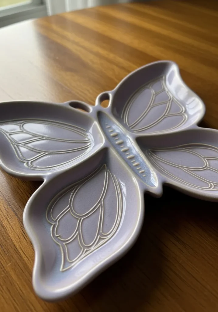 This lavender ceramic plate is shaped like a butterfly with softly curved wings and etched line details. The glaze is glossy and smooth, giving the surface a delicate shine. The wings create natural sections for sorting rings and earrings. It feels airy and decorative.