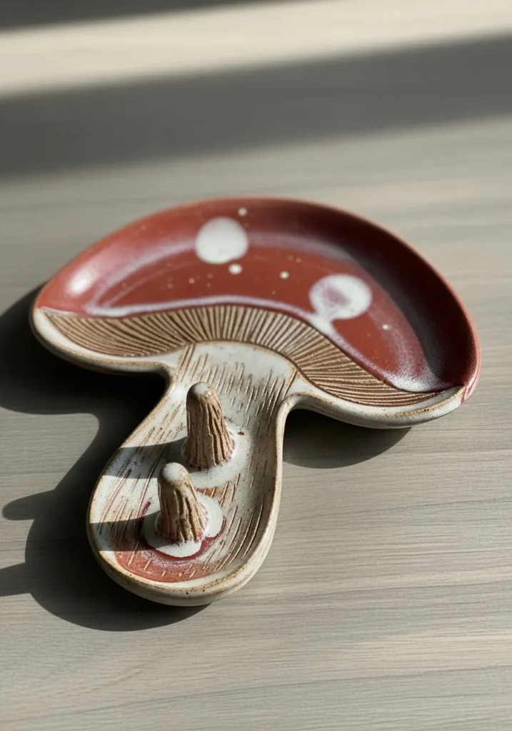 This charming ceramic plate is shaped like a woodland mushroom with a glossy deep red cap dotted in soft white. The stem forms a sturdy base while the shallow cap curves gently upward to hold rings and small earrings. Subtle carved lines along the stem add texture and depth. The glaze has a smooth shine that catches light beautifully in close up photos.