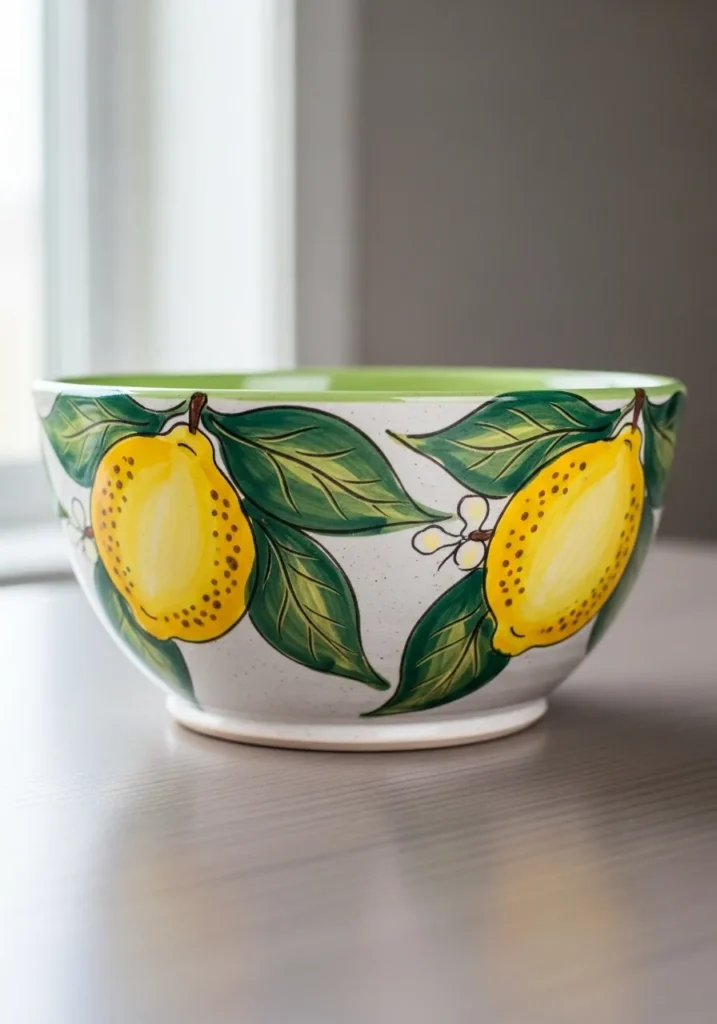Fruit designs are always a favorite of mine because they instantly bring a space to life. Painting lemons is surprisingly simple since their shapes are so forgiving and playful. I love how a bowl like this can brighten up a countertop even when it is empty. It is such an easy way to add a pop of color to everyday tableware.