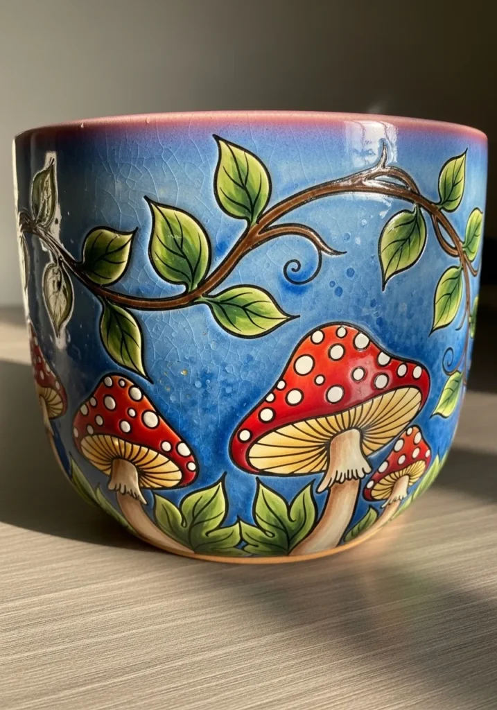 This rounded ceramic pot is painted in a rich woodland scene with bright red mushrooms dotted in white, curling green vines, and fresh leafy branches stretching across a deep blue background. The mushrooms have soft shading in cream and red, giving them a slightly storybook feel. The glossy glaze makes the colors pop, especially against the darker base, and the curved surface adds movement to the painted vines.