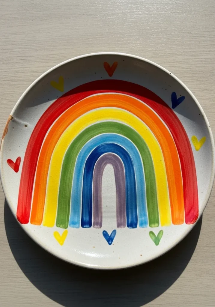 This round ceramic plate showcases a vibrant rainbow arcing across a clean white surface. The colors move from deep red to bright violet in bold, even strokes. Tiny hand painted hearts in blue, yellow, and red are scattered around the rainbow, adding a sweet and playful detail. The glossy glaze enhances the brightness and gives the whole piece a cheerful shine.