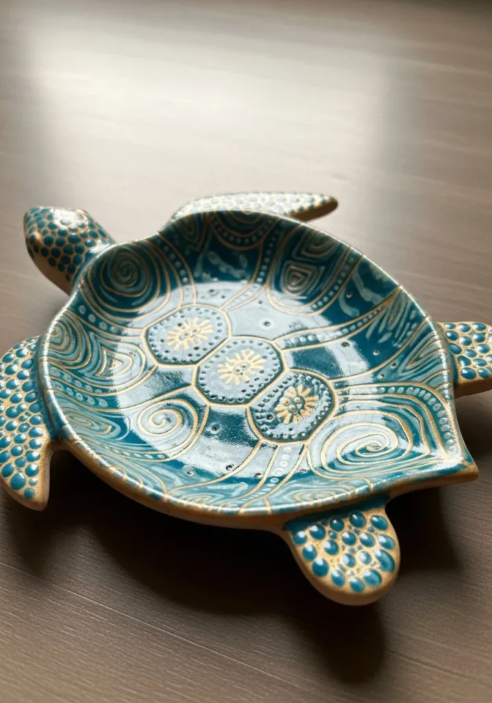 This ceramic turtle shaped dish is painted in layered shades of teal, aqua, and soft turquoise. The shell features intricate patterns with small circles and curved lines that create depth and texture. Subtle white highlights make the design stand out, while the glossy finish enhances the ocean inspired colors. The flippers and head are carefully outlined, giving the piece character and balance.