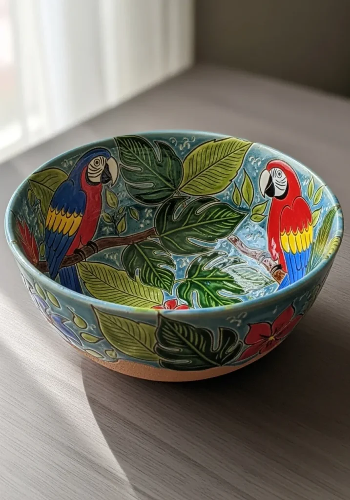 I think designs like this are such a fun way to play with bold color. Painting tropical leaves feels freeing because they do not have to be perfect to look beautiful. Adding a bright parrot instantly brings personality to the piece. It feels like a mini vacation sitting right on the kitchen counter.