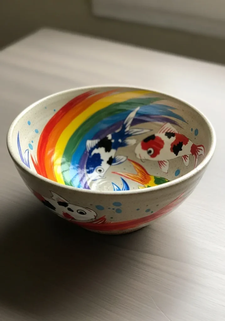 At first glance, this ceramic bowl looks simple on the outside with a clean white glaze. Inside, though, it bursts with hand painted rainbow arcs and playful splashes of blue, red, and yellow. The colors curve along the inner surface, creating a cheerful contrast against the smooth neutral exterior. The glossy glaze enhances the vibrancy of the paint and gives the bowl a bright, happy shine.