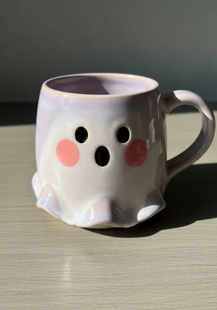 This adorable ceramic mug is shaped with a soft wavy base to resemble a little ghost. The body is painted in a gentle lavender tone with a glossy finish that gives it a smooth, almost candy like look. A simple black face with round eyes and a tiny open mouth adds character, while rosy pink cheeks make it extra charming. The handle curves neatly from the side in a matching glaze.