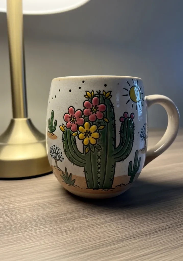 I always find mugs like this extra satisfying to paint because the curved surface gives the design a bit of character. Adding small flowers around a simple cactus makes the whole piece feel more thoughtful and unique. It is such a sweet weekend project that results in something you will actually use every morning. Coffee just tastes better in a handmade mug.