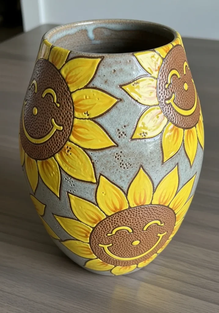 This ceramic vase features large, bold sunflowers wrapped around its rounded shape. The petals are painted in bright golden yellow with warm brown centers that have subtle smiling details. The background glaze leans toward a soft gray, which makes the flowers pop even more. The texture of the brushstrokes gives the petals movement and warmth, while the glossy finish ties everything together.