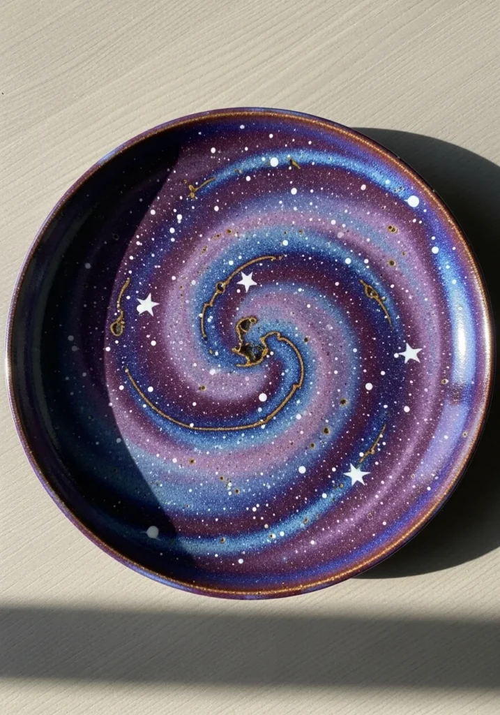 This round ceramic plate is painted with a stunning spiral galaxy that swirls from deep indigo to vibrant purples and soft pinks. Tiny white stars are scattered across the surface, some dotted and some lightly brushed to create a glowing effect. The glossy glaze enhances the depth of the colors, making the center spiral feel almost three dimensional. The smooth finish contrasts beautifully with the layered brushstrokes that give the galaxy its dreamy movement.