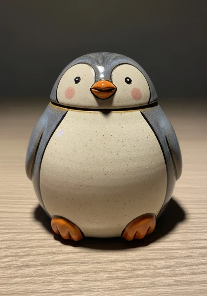This sweet ceramic penguin figurine is painted in soft shades of gray, creamy white, and warm orange for the beak and little feet. The body has a lightly speckled glaze that gives it a cozy handmade look. Blush pink cheeks and simple black eyes add charm and personality. The smooth rounded shape and glossy finish make it feel both polished and irresistibly cute.