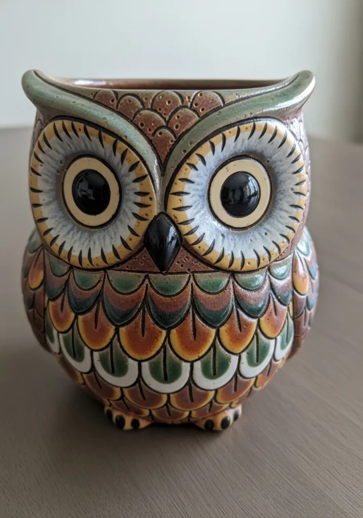 This ceramic owl planter is full of personality with layered feather patterns in earthy browns, soft greens, and muted oranges. The large round eyes are outlined in darker tones, creating a bold focal point against the textured body. Each feather is individually painted, giving the surface depth and a slightly raised look. The matte and glossy elements blend together beautifully, adding richness to the overall design.